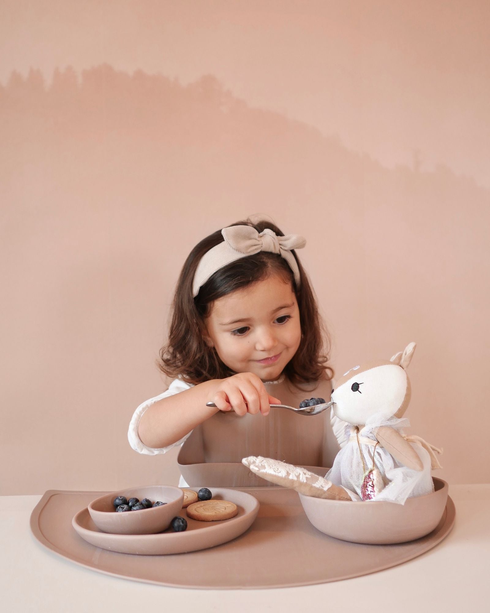 Geschirrset-Inhalt (5 Silikonartikel): Silikon-Tischset, Teller, Lätzchen, große und kleine Schälchen. Kindgerecht, aber mit einem erwachsenen Look für ein einheitliches Tischbild.